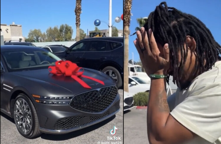 Keith, 27, shared the moment Ronni put his blind fold on and took him right on down to the car lot, where she surprised him with a brand new car.